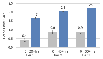 Across all grade groups and Reading Proficiency Tier groups, students who engaged in more Reading Plus instruction during the school year achieved reading proficiency gains that were significantly larger than those achieved by students who completed fewer or no lessons. The results also showed that students who engaged in more Reading Plus instruction developed more reading confidence and increased their interest in reading.