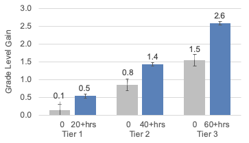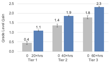 Reading proficiency growth was evaluated in relation to the amount of Reading Plus practice students completed. Within each grade group (elementary, middle, and high school), reading proficiency growth was also evaluated separately for each Reading Proficiency Tier group: