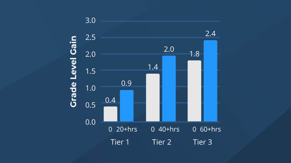 Across all tier groups, students who completed the recommended amount of Reading Plus instruction during the school year achieved significantly larger proficiency gains than students who did not engage in Reading Plus instruction.