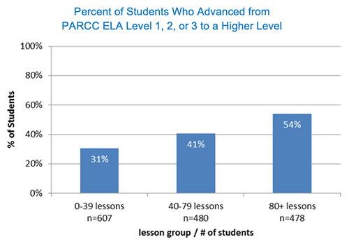 Students who completed at least 80 Reading Plus lessons consistently had the highest percentage rate of advancement to a higher PARCC ELA performance level assessment when compared to students who used Reading Plus less frequently.