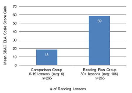 Students who completed at least 80 Reading Plus lessons achieved three times the SBAC ELA scale score gains in comparison to a group of demographically similar students who had minimal or no Reading Plus use (significant at p<.001). These scale score gains translated into more than twice as many Reading Plus students advancing to a higher SBAC ELA achievement level.