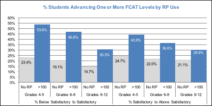 This study evaluated the changes in performance levels between the spring 2013 and spring 2014 administrations of the FCAT in relation to starting level on the FCAT and the amount of reading practice students engaged in. Reading practice was quantified in terms of the number of reading practice lessons completed.