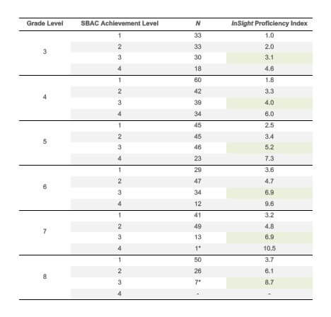 There also was good alignment between SBAC and InSight. Students who completed at least 80 reading practice lessons in Reading Plus improved their InSight reading proficiency by 1.5 grade levels. Those who achieved higher grade levels on the InSight assessment also achieved higher proficiency levels on the SBAC.