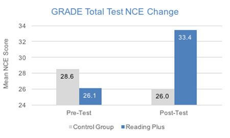 Baseline total scores on the GRADE suggested that students in this study performed below the national average for this population. Reading proficiency gains achieved by ELL students who used Reading Plus were significant, and significantly different from the control group. This was true for Total Test Normal Curve Equivalent (NCE) scores on the GRADE as well as for the GRADE vocabulary and reading comprehension sub-scores.