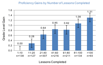 As well, students who completed 100 or more reading practice lessons (~30 hours) increased their silent reading rates significantly (p < .001).